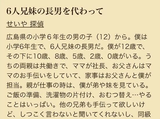 探偵ナイトスクープで取り上げられたのは、小学6年生の長男が6人兄妹の世話に疲れ果てた内容でした。