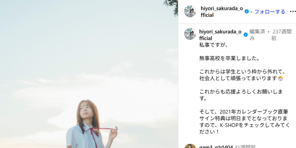 「私事ですが、無事高校を卒業しました。これからは学生という枠から外れて、社会人として頑張ってまいります。これからも応援よろしくお願いします」