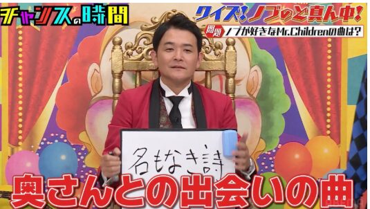 「好きなMr.Childrenの曲は?」という問題で『名もなき詩』と答えたノブさんが「奥さんとの出会いの曲」と妻との馴れ初めを語る場面も。
